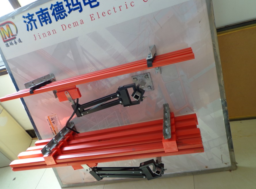 上部分分別為:角鋼支架、四孔提掛架、單極安全滑觸線、輕型集電器、集電器支架;